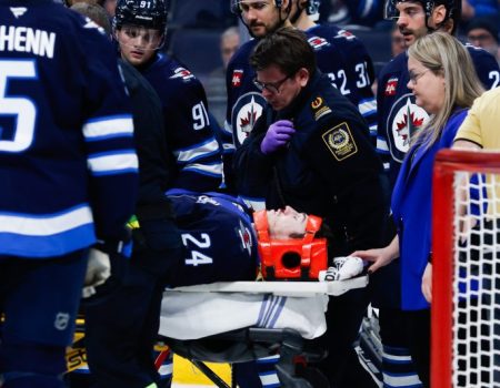 Winnipeg Jets defenseman Haydn Fleury was stretchered off the ice and...